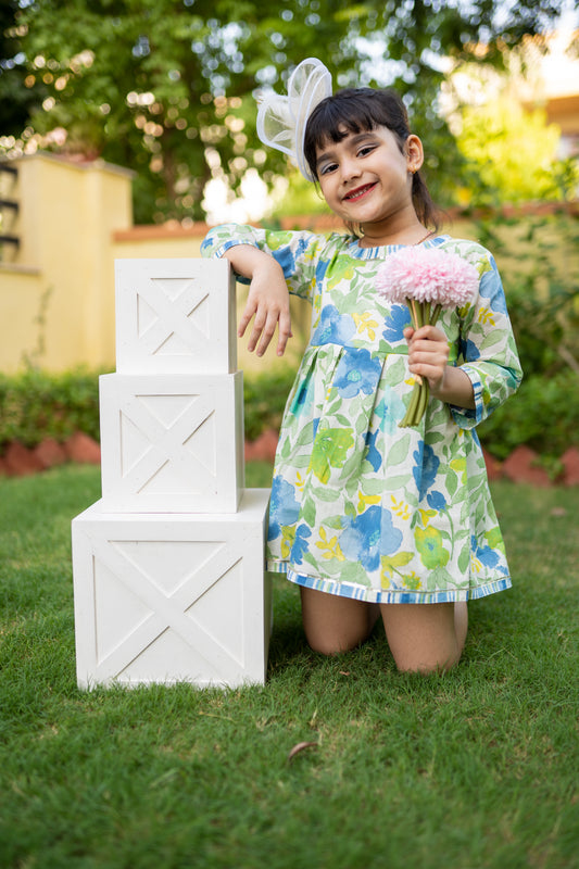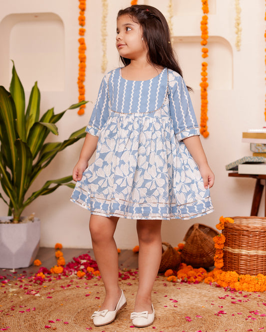 Girls Powder Blue / Pink Pleated Knee-length Short Cotton Dress