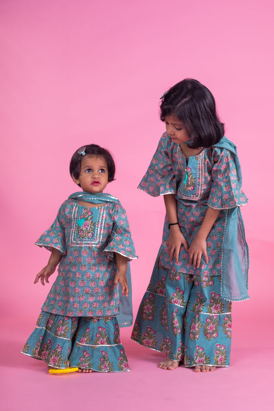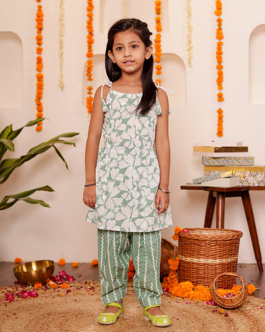 Girls Pretty Floral Spaghetti Kurta with Semi Patiala Pant - Green / Yellow / Aqua