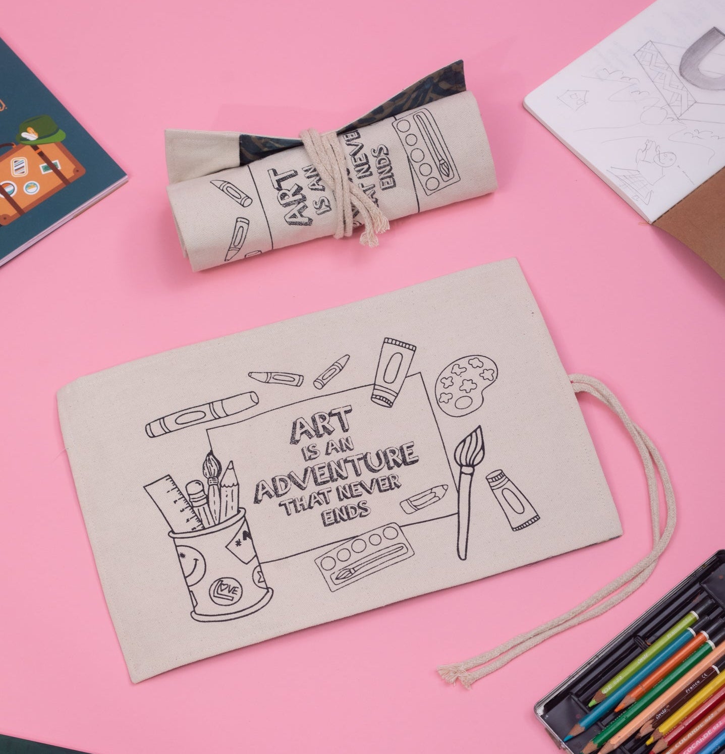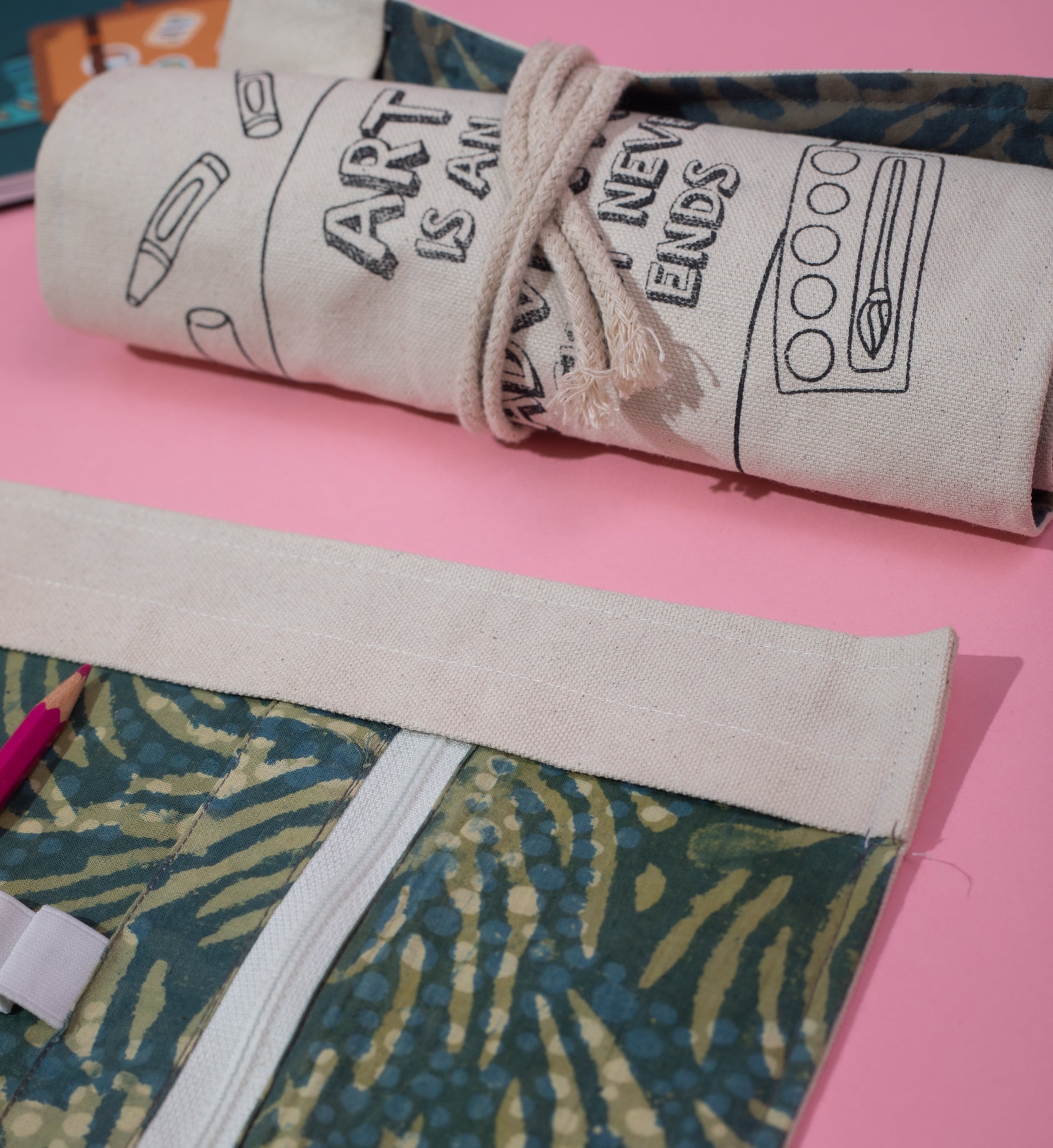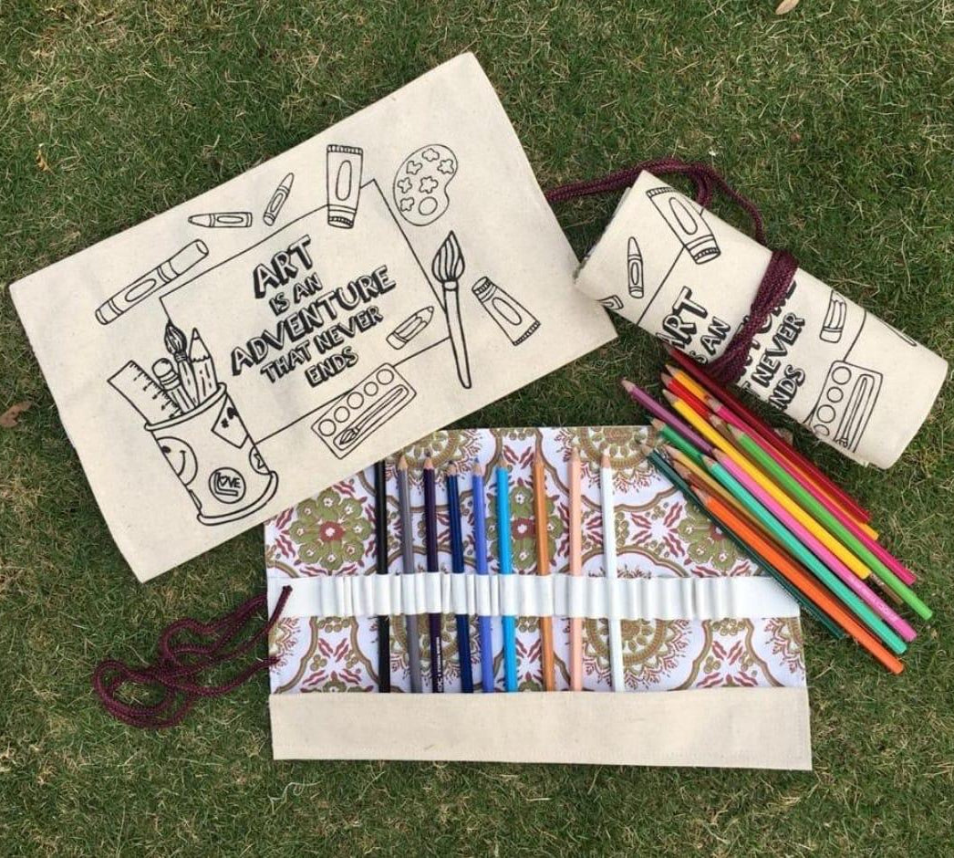 Convenient, easy, and space-saving. Shreeya's India's Roll up pencil case is a must-have for any stationery buff, student or just to organize your desk neatly. The pouch can easily hold up to 24 pens/pencils/brushes at a time and will ensure the safety of your stationery keeping it handy at all times! These sleek pencil wrap cases are made of sturdy canvas fabric from the outside with a print that can be painted and cotton lining inside. Our 100% eco-friendly pencil case can also bring out the creativity in you with the DIY cover and style your own design.